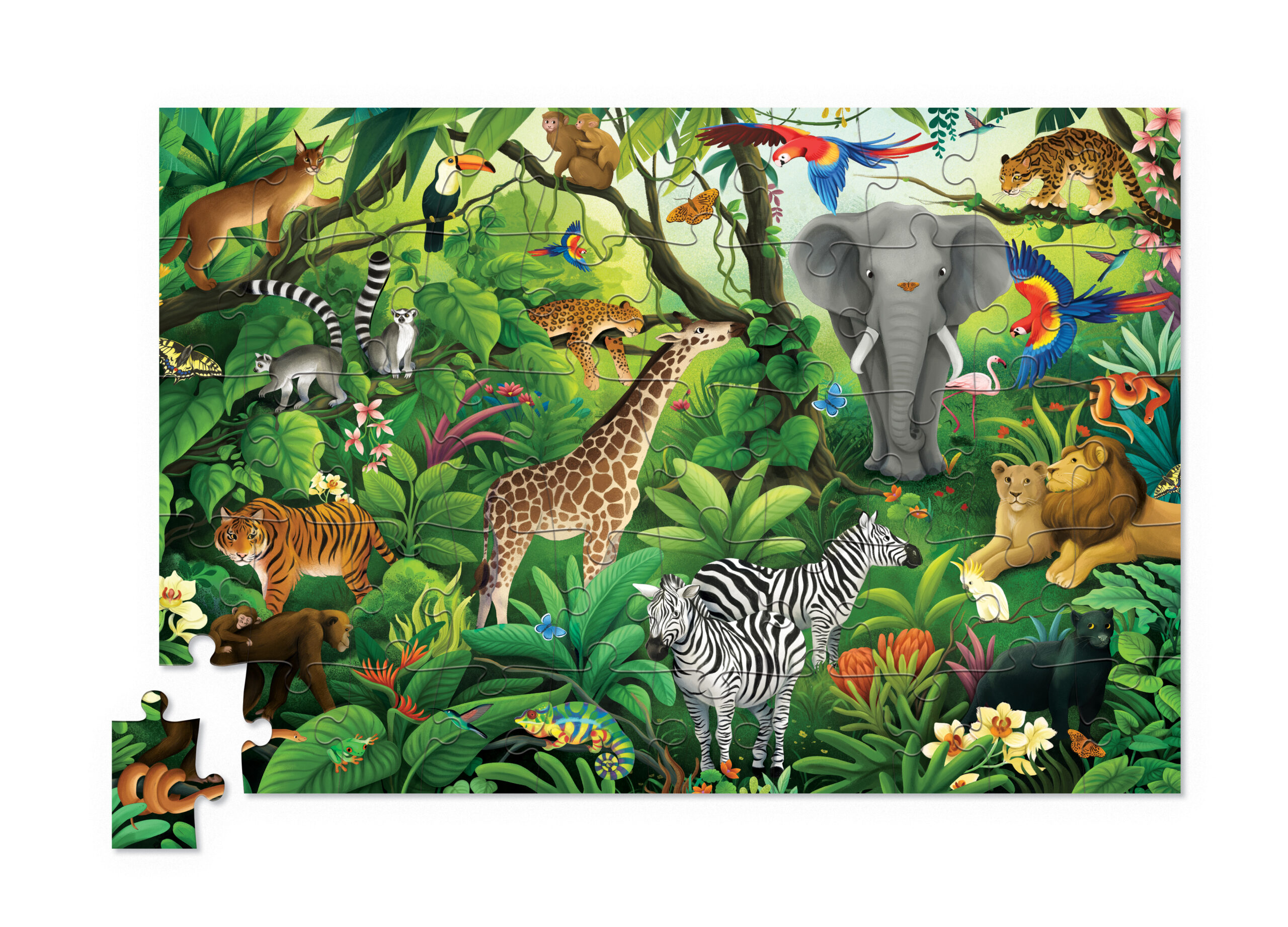 Sparkly delight! Discover a captivating jungle with this 50-piece holographic puzzle! Bring the adventure to life with dazzling foil accents and vibrant, detailed illustrations of beetles, butterflies, and busy critters while developing puzzle-solving skills and hand-eye coordination. Crafted with high-quality blue board and soy-based inks, this puzzle will amaze and delight for years to come.
