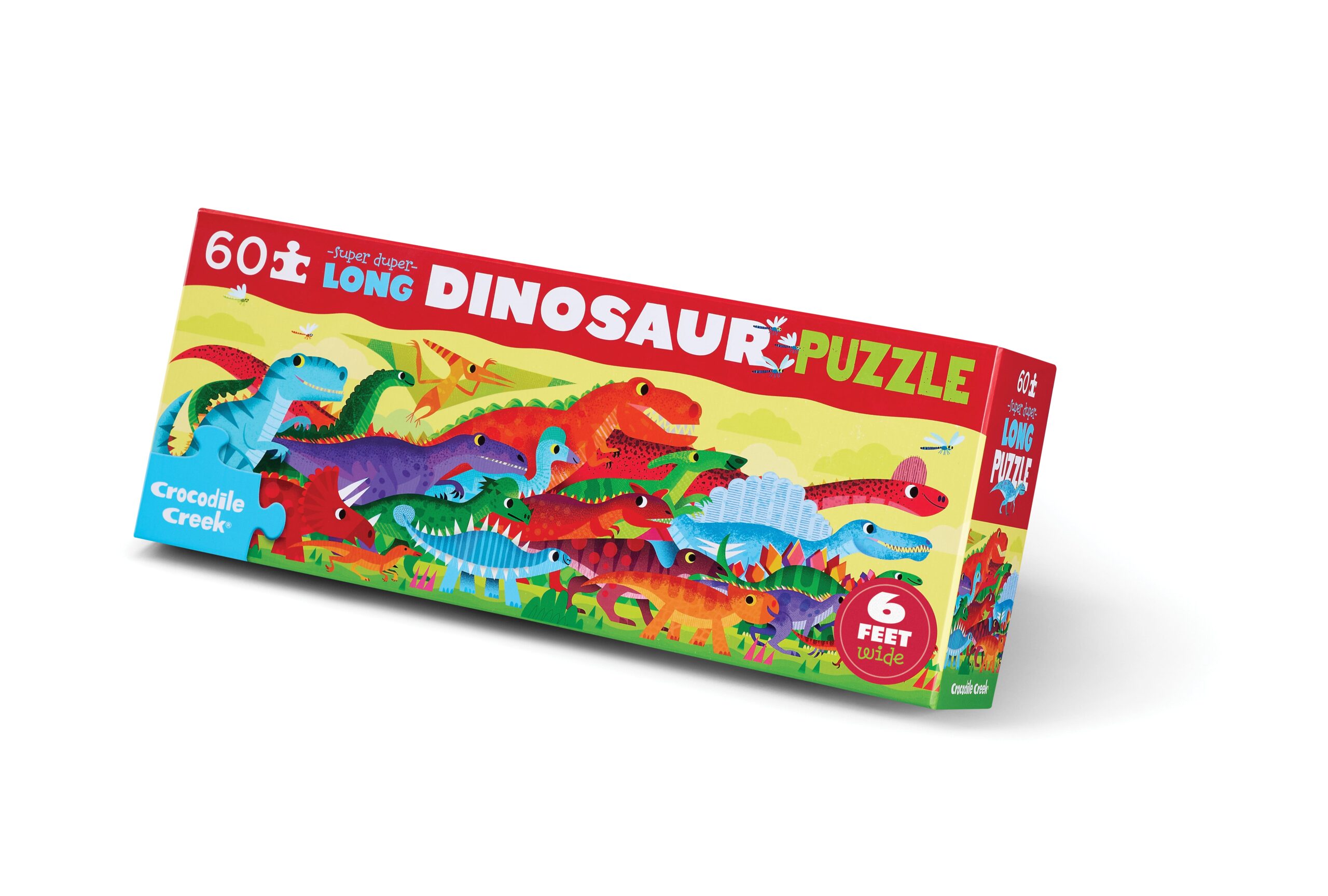 Roar into prehistoric times! Our Dino World 60-piece super duper long puzzle brings the age of dinosaurs to life in an impressive 183 cm x 31 cm size. Featuring mighty dinosaurs including T-Rex, Triceratops, Stegosaurus, Brachiosaurus, and soaring Pteranodons, this extra-long puzzle encourages hand-eye coordination and problem-solving while sparking imagination. Perfect for children ages 4 and up ready for a bigger challenge, this unique format is great for interaction between a parent and child that can be used over and over. A sturdy box makes for easy storage.