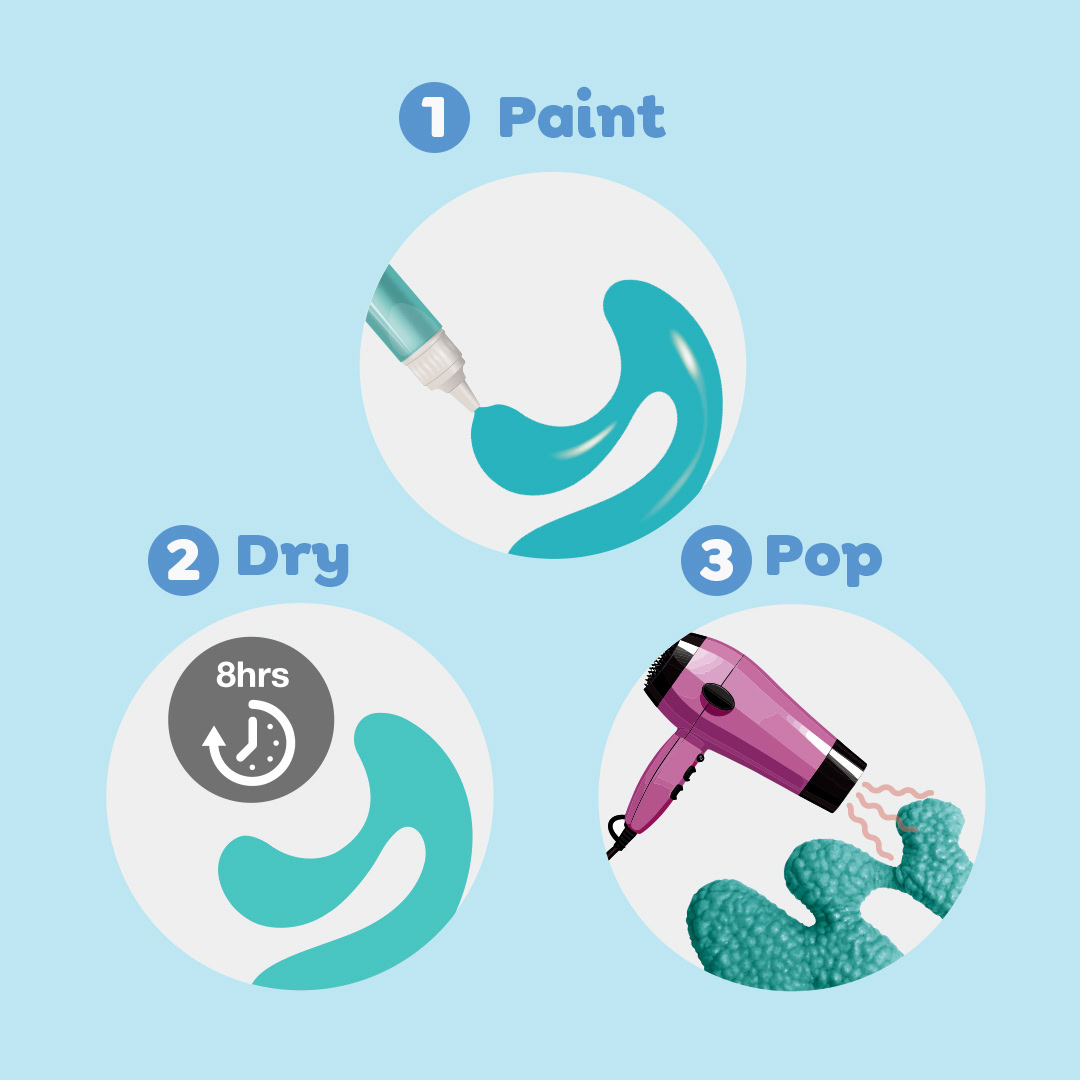 Draw, dry and pop! Kids will love giving their artwork a puffy, popcorn scented twist with these fun 3d pens. Available in eight vibrant colours, Puffy Popcorn Pens go on like a paint; once dry, applying heat (from a hairdryer) will make the artwork puff up, crackle and pop. Requires adult supervision.